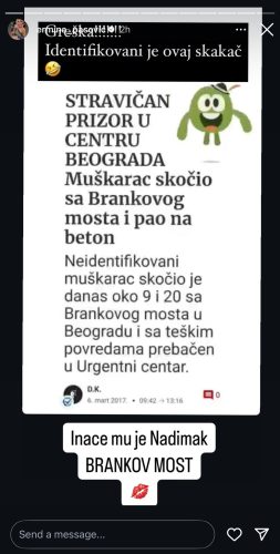 Naime, 6. marta 2017. godine izašao je tekst na jednom portalu kako je muškarac skočio sa Brankovog mosta i pao na beton tom prilikom.