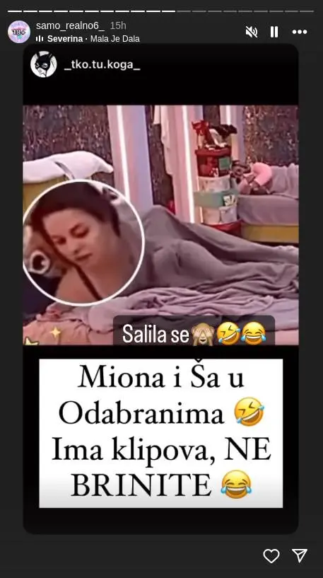 – Miona i Ša u odabranima. Ima klipova, ne brinite – piše u opisu objave na jednoj fan stranice koja prati dešavanja u rijalitiju.