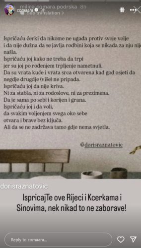 – Ispričaću čerki da nikome ne ugađa protiv svoje volje i da nije dužna da se javlja rodbini koja se nikada za nju nije našla. Ispričaću joj kako ne treba da trpi jer su joj po rođenju trpljenje nametnuli. Da su vrata kuće i vrata srca otvorena kad god oseti da negde drugde (više) ne pripada. Ispričaću joj da nije kriva. Ni za stablam ni za rodoslave, ni za prezimena. Da je sama po sebi i koren i grada. Ispričaću joj i da voli da svakim voljenjem svega oko seve otvara i brave bez ključa, Ali da se ne zadržava tamo gde nema sveta – objavila je Milica ove reči i dodala: