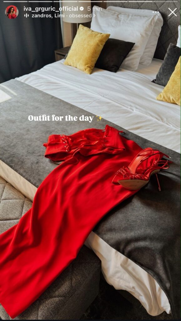 Na sledećem storiju ona je pokazala predivnu crvenu haljinu na krevetu, te samim tim i odgovorila svima na pitanje, a to je da se ona sprema da ode na nečiju svadbu!