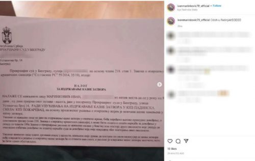 Naime, u rešenju koje je dobio, nalaže se da kažnjeno lice Ivan Marinković u roku od 8 dana, od dana prijema poziva, treba da se javi u pisarnicu Prekršajnog suda u Beogradu radi upućivanja na izdržavanje kazne zatvora u KPZ Padinska skela u Požarevcu. A ukoliko se ne javi biće organizovano njegovo prinudno dovođenje o njegovom trošku.