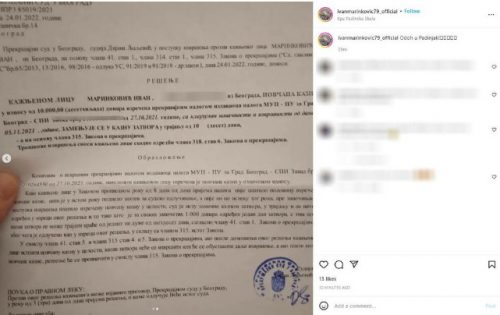 Ivan Marinković je rešenje iz suda podelio na svom Instagram profilu, uz kratak komentar.