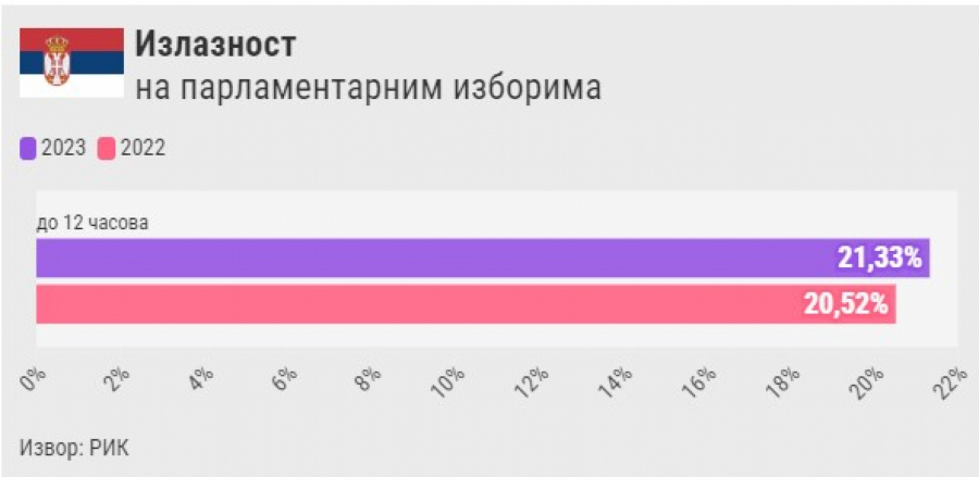 13:30 Prema podacima Pokrajinske izborne komisije izlaznost birača na teritoriji AP Vojvodine do 12 časova iznosi 22, 88 odsto.