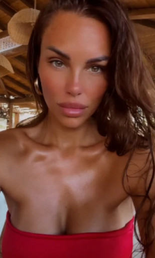 Ona se nedavno snimila u crvenom kupaćem kostimu, gde su se posebno istakli njen dekolte, preplanuli ten i velike zlatne minđuše koje je nosila.