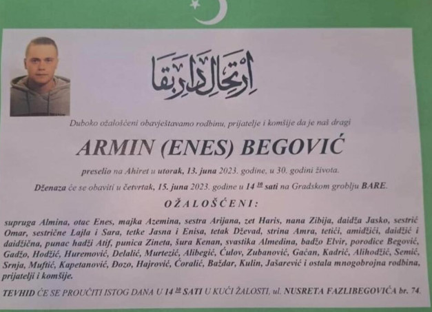 Sin Enesa Begovića Amir Spahić preminuo je u utorak u 30. godini u Sarajevu.