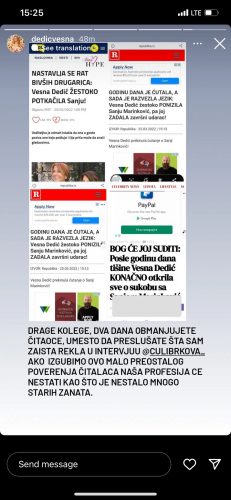 -Drage kolege, dva dana obmanjujete čitaoce, umesto da preslušate šta sam zapravo rekla u emisiji. Ako izgubimo ovo malo preostalog poverenja čitalaca naša profesija će nestati kao što je nestalo mnogo starih zanata – napisala je Vesna.