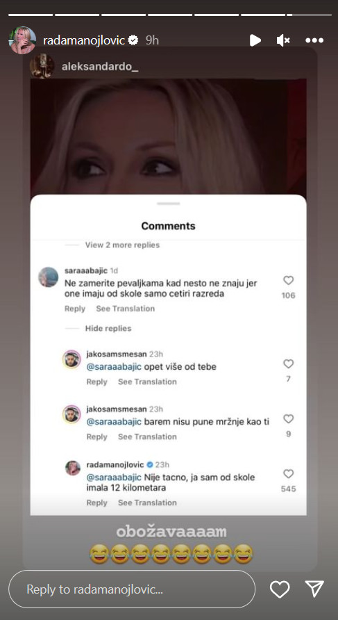 Rada Manojlović neretko odgovara svojim pratiocima na komentare, bez obzira da li su pozitivni ili negativni, te je ovo dokaz kako ona ne mari za kritike na njen račun.