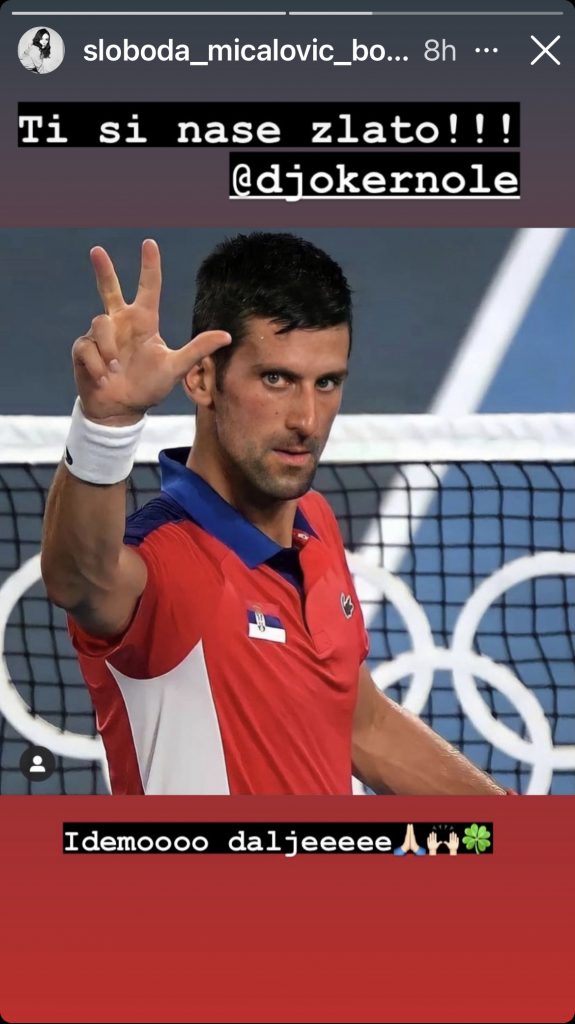 Glumica Sloboda Mićalović na svom Instagram profilu podržala je Novaka Đokovića koji je danas, 30 jula, na veliku žalost i iznenađenje izgubio od Aleksandra Zvereva u polufinalu Olimpijskih igara, a potom i i sa Ninom Stojanović od Rusa u dublu.