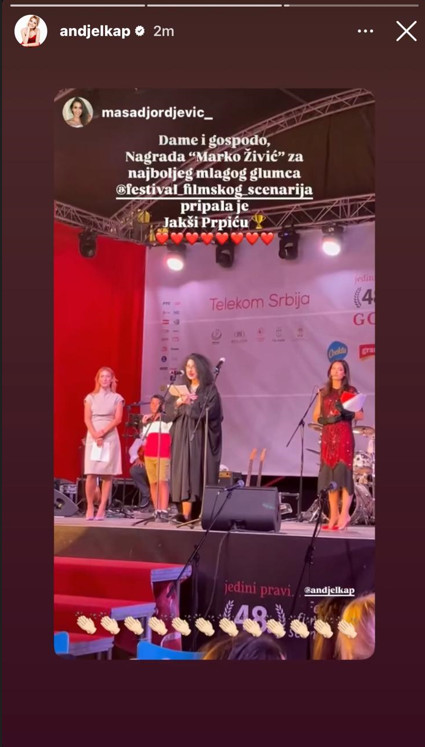 – Dame i gospodo, Nagrada „Marko Živić“ za najboljeg mladog glumca na Festivalu Filmskog Scenarija u Vrnjačkoj banji pripala je Jakši Prpiću – stajalo je u objavi koju je ponosno podelila naša poznata glumica Anđelka Prpić.