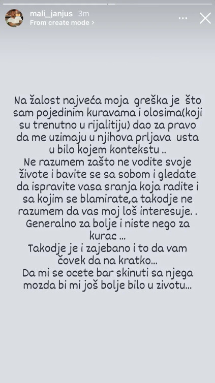 – Nažalost najveća moja greška je što sam pojedinim k**vama i ološima (koji su trenutno u rijalitiju) dao za pravo da me uzimaju u njihova prljava usta u bilo kojem kontekstu…Ne razumem zašto ne vodite svoje živote i bavite se sa sobom i gledate da ispravite vaša sr**a koja radite i sa kojim se blamirate, a takođe ne razumem da vas moj loš intresuje…Generalno za bolje i niste nego za ku**c… – napisao je on, pa dodao: