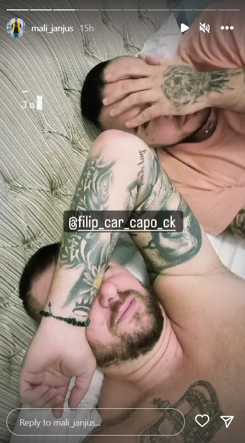 Janjuš je na svom Instagramu i prokomentarisao ironično Majin i Markov poljubac, a zatim okačio fotku njega i Cara kako leže u krevetu sa rukama preko glave.
