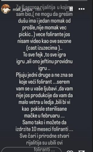 Sada se setio da oplete po rijaliti učesnicima i da ih nazove folirantima. Nije spominjao imena, ali se pretpostavlja na koga je mislio. Naravno posle tog njegovog posta na Instagramu odmah su krenula šuškanja na koga se sve što je rekao odnosi.