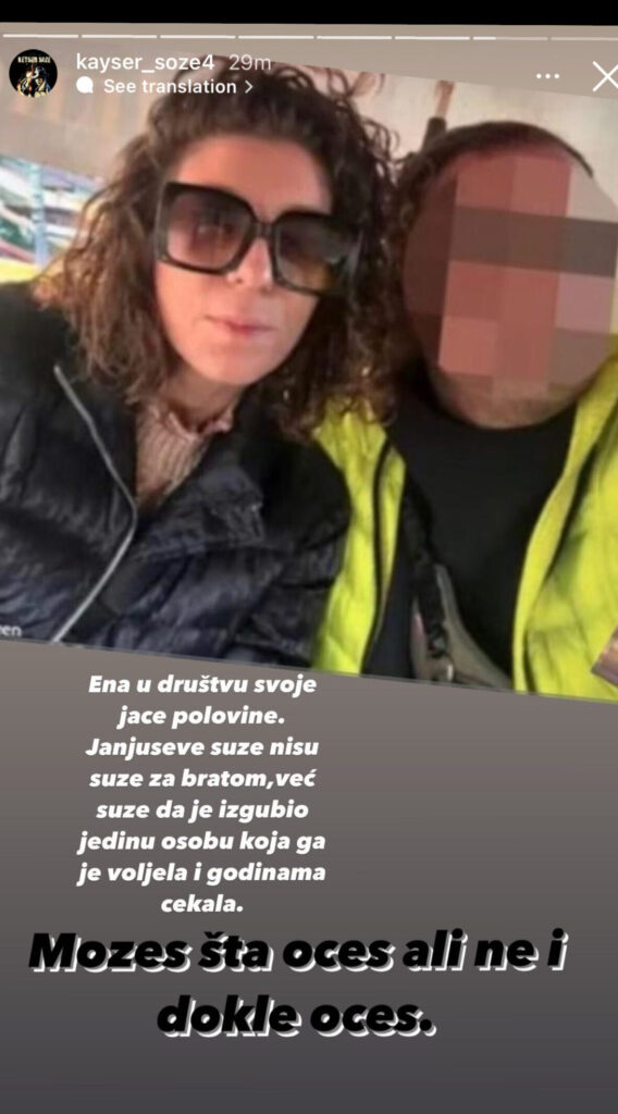 – Ena u društvu svoje jače polovine. Janjuševe suze nisu suze za bratom, već suze da je izgubio jedinu osobu koja ga je volela i godinama čekala. Možeš šta hoćeš, ali ne i dokle hoćeš – glasila je objava na Instagram storiju profila koji prati sva aktuelna dešavanja unutar rijalitija.