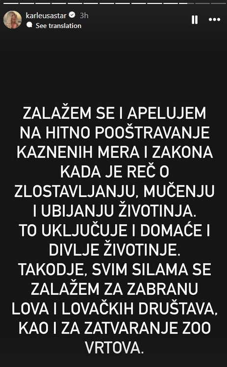 „Zalažem se i apelujem na hitno pooštravanje kaznenih mera i zakona kada je reč o zlostavljanju, mučenju i ubijanju životinja. To uključuje i domaće i divlje životinje. Takođe, svim silama se zalažem za zabranu lova i lovačkih društava, kao i za zatvaranje zoo-vrtova“, napisala je Karleuša na Instagram storiju.