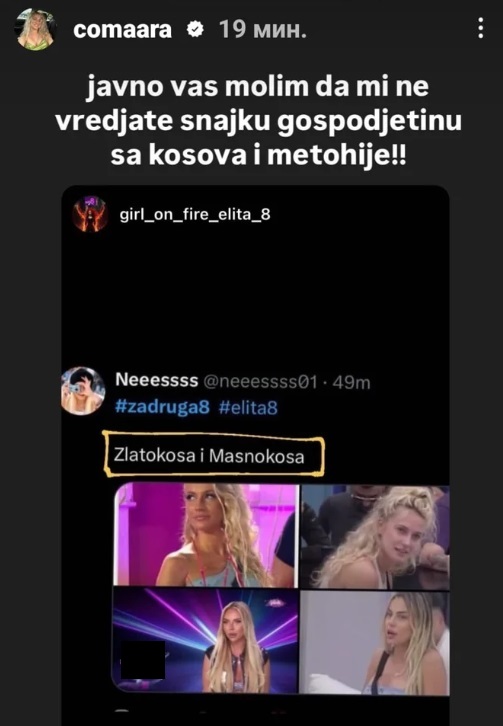 – Javno vas molim da mi ne vređate snajku gospođetinu sa Kosova i Metohije – napisala je Milica uz skrinšot objave sa društvene mreže „Iks“, gde su uporedili njene sa Sofijinim slikama, ali i nadimke koje su im dodelili – masnokosa i zlatokosa.