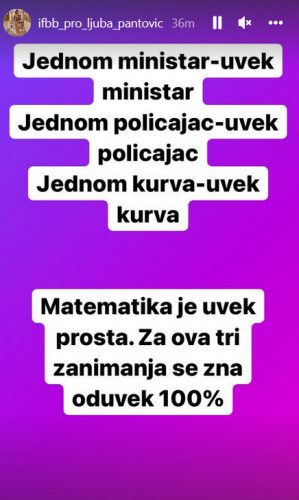 – Jednom ministar – uvek ministar. Jednom policajac – uvek policajac. Jednom k*rva – uvek k*rva. Matematika je uvek prosta – napisala je Ljuba.