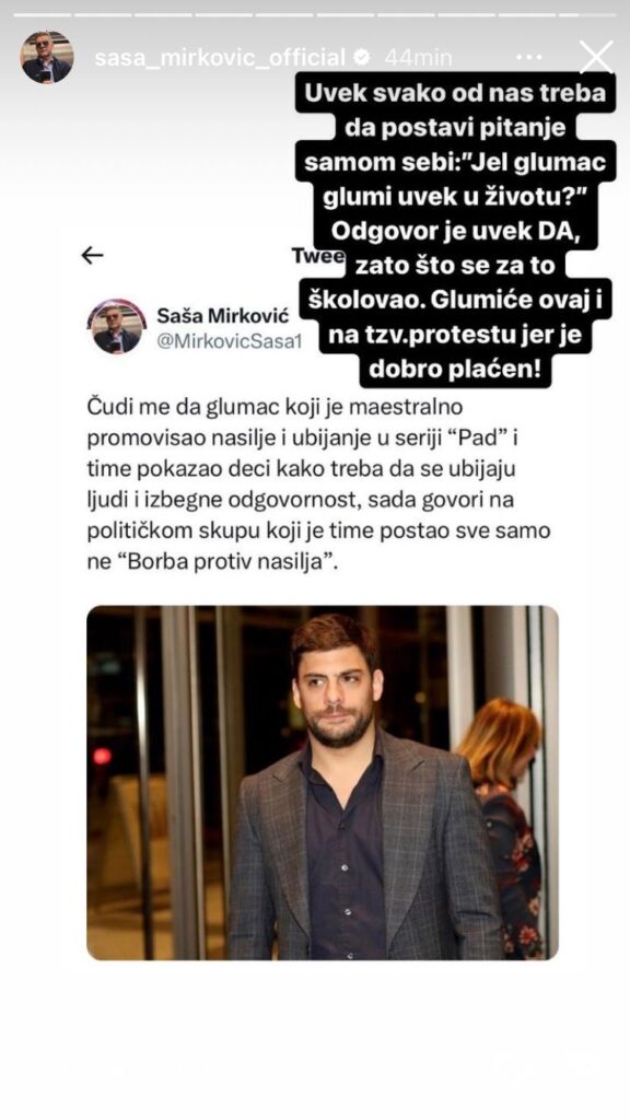 – Čudi me da glumac koji je maestralno promovisao nasilje i ubijanje u seriji “Pad” i time pokazao deci kako treba da se ubijaju ljudi i izbegne odgovornost, sada govori na političkom skupu koji je time postao sve samo ne “Borba protiv nasilja” – napisao je na svom Instagram profilu Saša Mirković, direktor “Hype produkcije”.