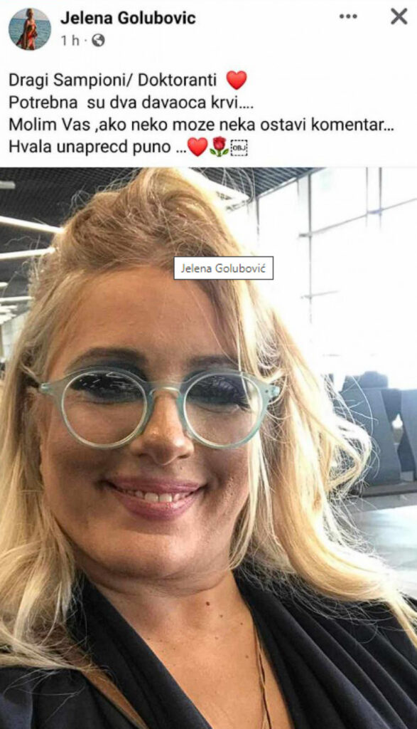 – Dragi šampioni/doktoranti, potrebna su mi dva davaoca krvi. Molim vas, ako neko može da ostavi komentar. Hvala unapred – napisala je Jelena u opisu objave.