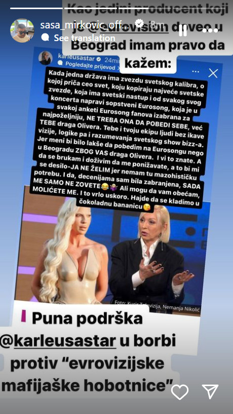 -Kao jedini producent koji je Euroviziju doveo u Beograd imam pravo da kažem: Puna podrška Jeleni Karleuši protiv „evrovizijske mafijaške hobotnice“ – istakao je vlasnik i osnivač jedne od naših najpoznatijih muzičkih, filmskih i tv produkcija Hype Production, Saša Mirković.
