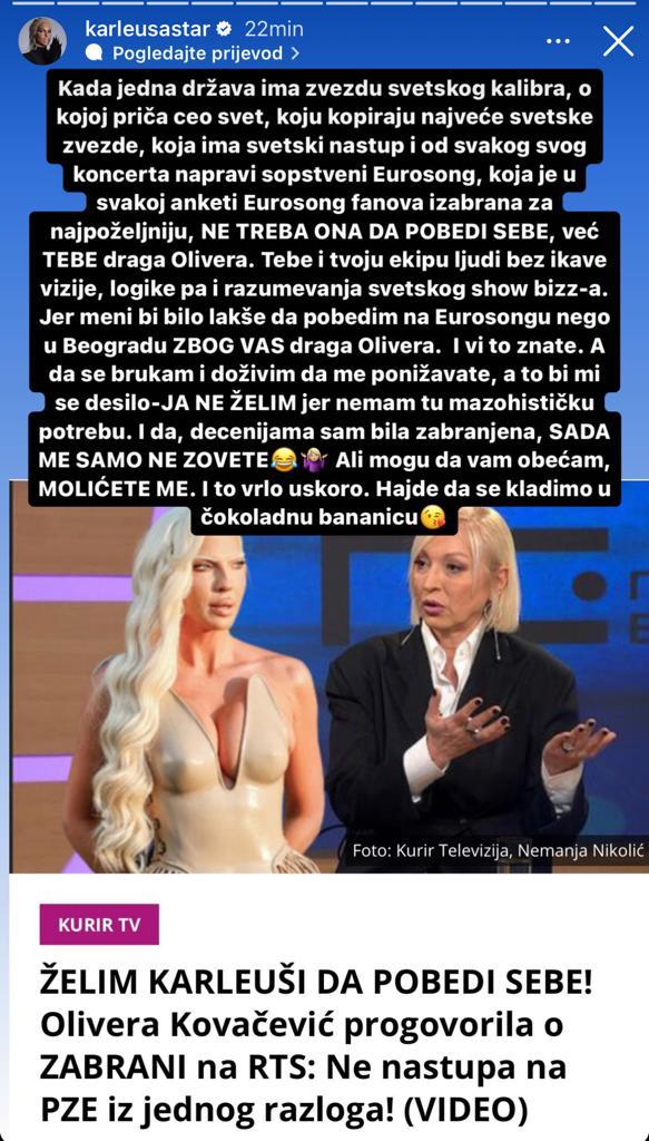 Bivša urednica zabavnog programa na Javnom servisu 8 supervizorka muzičkog takmičenja „Pesma za Evroviziju“, Olivera Kovačević, progovorila je u jednoj emisiji o navodima da je Jelena Karleuša zabranjena na toj televiziji.