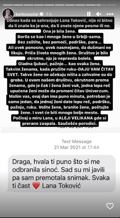 „Draga, hvala ti puno što si me odbranila sinoć. Sad su mi javili pa sam premotala snimak. Svaka ti čast. Lana Toković“ – napisala je Lana Karleuši tada.