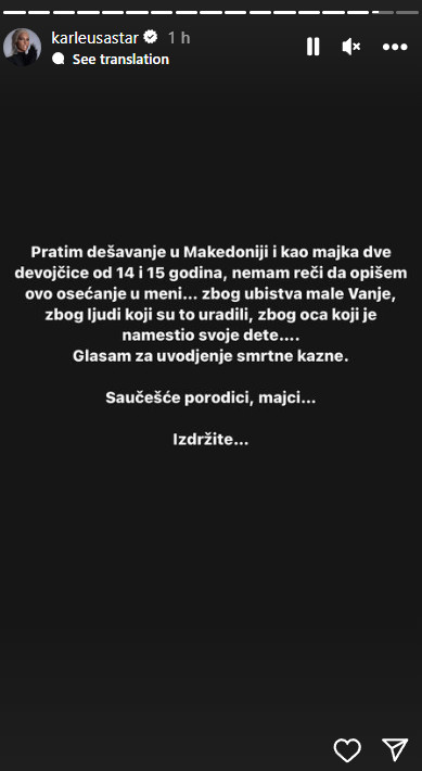 – Pratim dešavanja u Makedoniji i kao majka dve devojčice od 14 i 15 godina, nemam reči da opišem ovo osećanje u meni zbog ubistva male Vanje, zbog ljudi koji su to uradili, zbog oca koji je namestio svoje dete. Glasam za uvođenje smrtne kazne. Saučešće porodici, majci… Izdržite – napisala je Jelena u svojoj objavi.