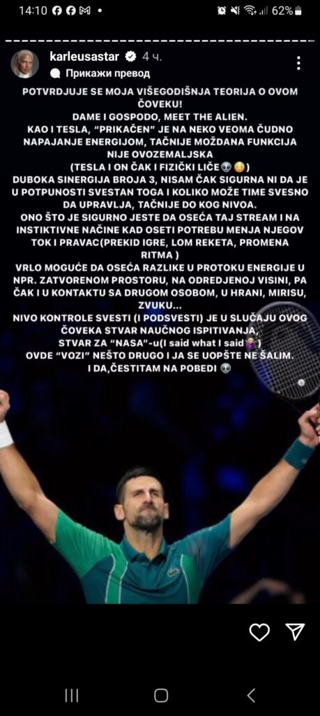 „Potvrđuje se moja višegodišnja teorija o ovom čoveku. Dame i gospodo, upoznajte vanzemaljca. Kao i Tesla, prikačen je na neko čudno napajanje, tačnije, možda funkcija nije ovozemaljska (Tesla i on čak i fizički liče). Dubinska sinergija broja 3, nisam čak ni sigurna da je u potpunosti svestan toga i koliko može time svesno da upravlja, tačnije do kog nivoa. Ono što je sigurno jeste da oseća taj strim i da na instiktivne načine kad oseti potrebu menja njegov otok i pravac (prekid igre, lom reketa, promena ritma). Vrlo moguće da oseća razlike u protoku energije, na primer u zatvorenom prostoru, na određenoj visini, pa čak i u kontaktu sa drugom osobom, u hrani, mirisu, zvuku… Nivo kontrole svesti (ili podsvesti) je u slučaju ovog čoveka stvar naučnog ispitivanja, stvar za NASA, rekla sam šta sam rekla. Ovde vozi nešto drugo i ja se uopšte ne šalim. I da, čestitam na pobedi„, napisala je Karleuša.