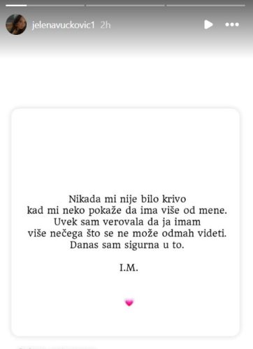 „Nikada mi nije krivo kad mi neko pokaže da ima više od mene. Uvek sam verovala da ja imam više nečega što se ne može odmah videti. Danas sam sigurna u to“, pisalo je.