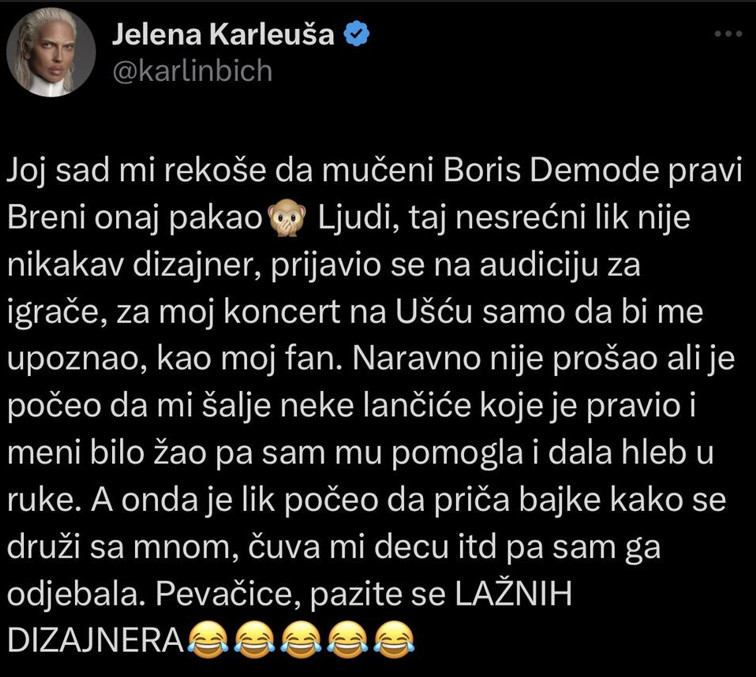 – Joj sad mi rekoše da mučeni Boris Demonde pravi Breni onaj pakao. Lju, taj nesrećni lik nije nikakav dizajner, prijavio se na audiciju za igrače, za moj koncert na Ušću samo da bi me upoznao, kao moj fan. Naravno nije prošao ali je počeo da mi šalje neke lančiće koje je pravio i meni bilo žao pa sam mu pomogla i dala hleb u ruke. A onda je lik počeo da priča bajke kako se druži sa mnom, čuva mi decu itd, pa sam ga se otarasila. Pevačice, pazite se lažnih dizajnera – istakla je JK.
