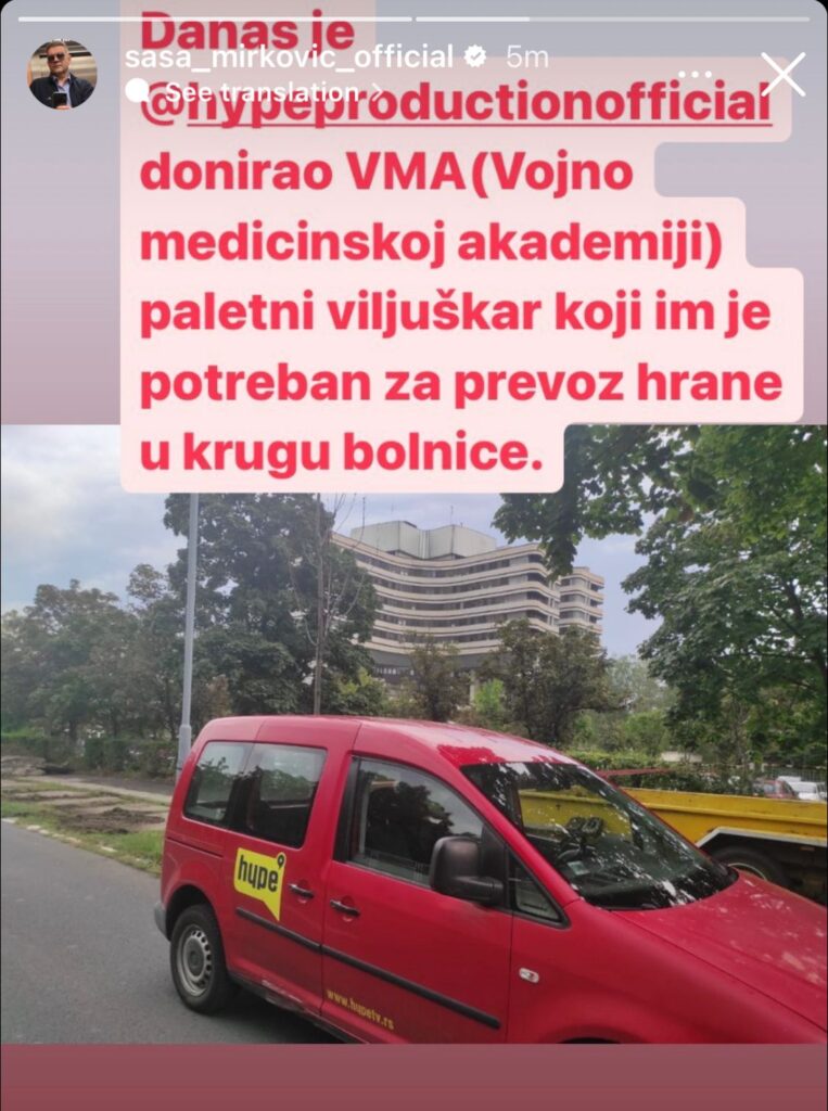 -Danas je Hype produkcija donirala VMA (Vojno medicinskoj akademiji) paletni viljuškar koji im je potreban za prevoz hrane u krugu bolnice – napisao je Mirković na svom storiju.