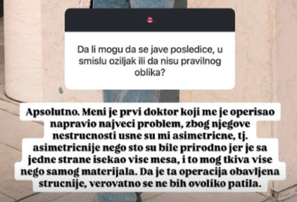 Ona se požalila na doktora koji joj je uradio zahvat, te ne može da se nakaje što je uopšte svojevremeno i povećavala usne hirurškim zahvatom.