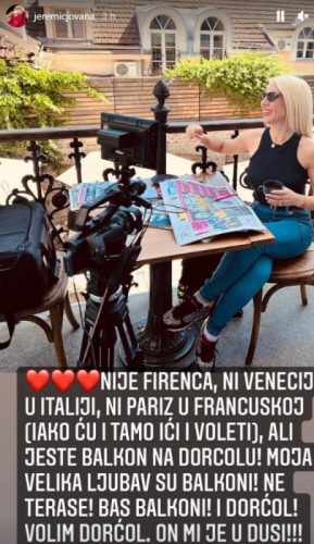 – Nije Firenca, ni Venecija u Italiji, ni Pariz u Francuskoj, iako ću i tamo ići i voleti, ali jeste balkon na Dorćolu! Moja velika ljubav su balkoni! Ne terase! Baš balkoni! I Dorćol! Volim Dorćol, on mi je u duši! – napisala je voditeljka Jovana na Instagram storiju.