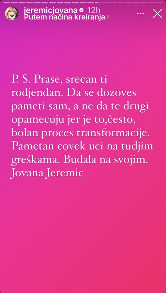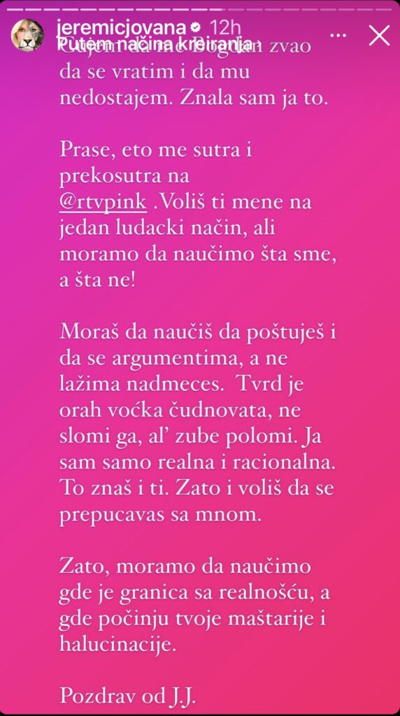– Čujem da me Bogdan zvao da se vratim i da mu nedostajem. Znala sam ja to. Prase, eto me sutra i prekosutra na televiziji „Pink“. Voliš ti mene na jedan ludački način, ali moramo da naučimo šta sme, a šta ne. Moraš da naučiš da poštuješ i da se argumentima, a ne lažima nadmećeš – počela je izlaganje na Instagramu Jeremićeva.