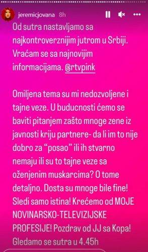 – Krećemo da otvaramo Pandorinu kutiju! Pričaćemo o nedozvoljenim i tajnim vezama – za što dame iz mog posla kriju svoje partnere? Da li zato što ih stvarno nemaju, da li to smeta za karijere njihovih partnera, ili pod tri, zato što su u vezi sa oženjenim partnerima. Dosta su mnoge bile fine – napisala je između ostalog Jovana i dodala: