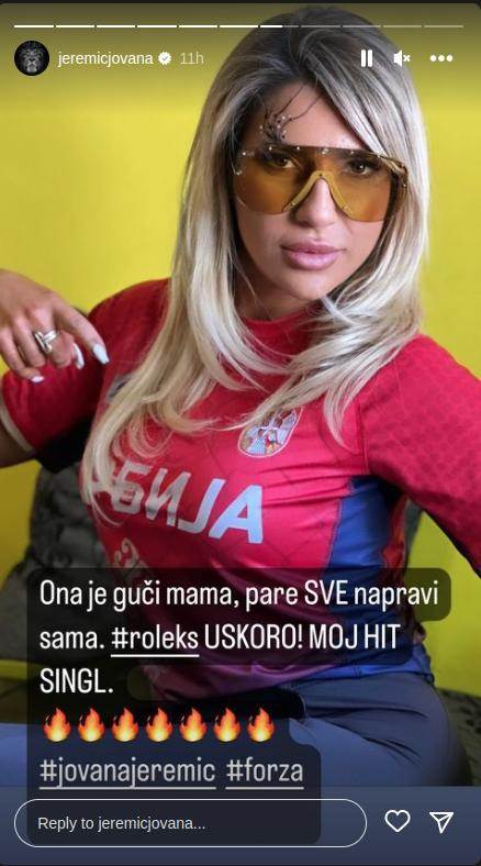 U numeri „Roleks“ će se čuti stih „Ona je Guči mama, sve pare napravi sama„, što je Jovana otkrila na Instagramu obučena u dres reprezentacije Srbije i dodala da „od danas ništa neće biti isto u srpskom šoubiznisu“.