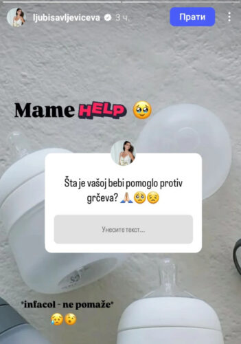„Mame pomoć. Šta je vašoj bebi pomoglo protiv grčeva? Ovo ne pomaže“ – pitala je Jovana, a nema sumnje da su su uskoro pristigli brojni korisni saveti.