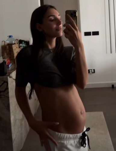 Za ovu priliku, nosila je udobnu belu trenerku i jednostavnu majicu koju je podigla do grudi, naglašavajući svoj trudnički stomačić – simbol nove životne uloge koju s radošću iščekuje.