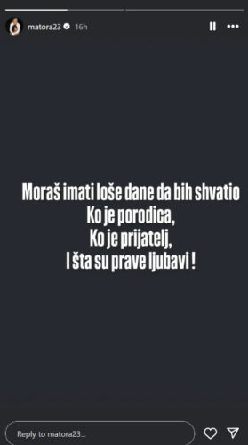 – Moraš imati loše dane da bi shvatio ko je porodica, ko je prijatelj i šta su prave ljubavi – napisala je Matora na svom instagramu.