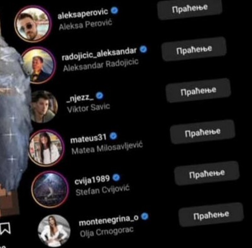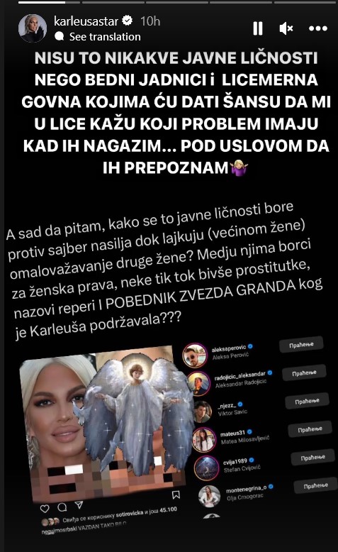 – A sad da pitam, kako se to javne ličnosti bore protiv sajber naselja dok lajkuju (većinom žene) omalovažavanje druge žene? Među njima borci za ženska prava, neke Tiktok bivše prostitutke, nazovi reperi i pobednik Zvezda Granda kog je Karleuša podržavala? – napisao je šokirani korisnik. A kako se vidi na fotografiji, neke od tih javnih ličnosti su i Aleksa Perović, Aleksandar Radojičić, Viktor Savić, Sloboda Mićalović, Matea Milosavljević, Olja Crnogorac, Stefan Cvijović Cvija i Katarina Sotirović. Nakon što su ove fotografije došle do nje, JK je u svom stilu oplela po ovim javnim ličnostima: