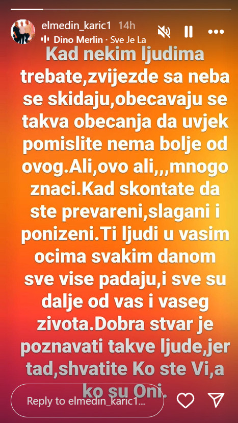 „Kad nekim ljudima trebate, zvezde sa neba se skidaju. Obećavaju se takva obećanja da uvek pomislite kako nema bolje od ovog… Ali ovo mnogo znači. Kad skontate da ste prevareni, slagani i poniženi“, započeo je Elmedin.