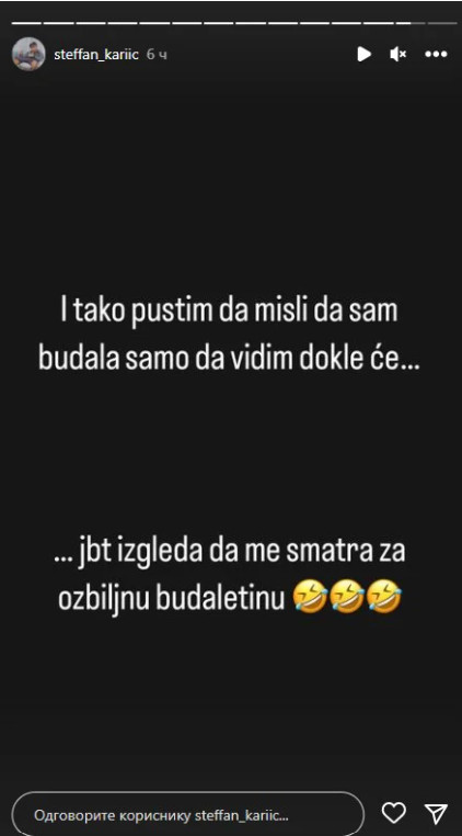 Naime, Stefan Karić neretko objavljuje zanimljive storije pune provokacija i ,,udaranja“ na bivšu devojku Jovanu, a ovoga puta se na svom Instagram nalogu obratio nekome i poručio sledeće:
