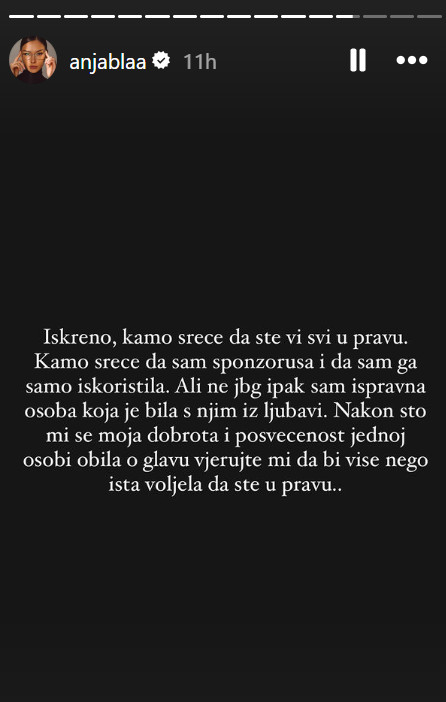 – Iskreno, kamo sreće da ste svi vi u pravu. Kamo sreće da sam sponzoruša i da sam ga samo iskoristila. Ali ne… Ipak sam ispravna osoba koja je bila sa njim iz ljubavi“, napisala je Anja.