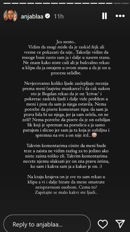 „Neverovatno koliko ljude zaslepljuje mržnja prema meni (najviše muškarce). I da čak nakon što je Bogdan rekao da je on „krivac“ i pokretač raskida. Ljudi i dalje vide problem u meni i pišu da sam ja njega ostavila.„