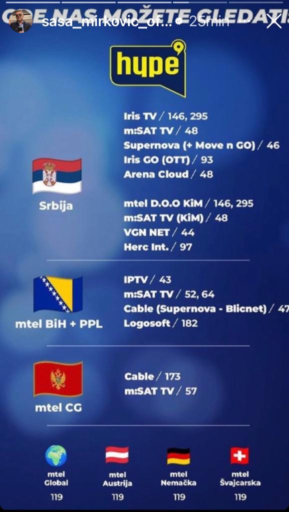 Takođe, ako ste u Bosni i Hercegovini, Crnoj Gori, Austriji, Nemačkoj ili Švajcarskoj, glavni i odgovorni urednik i direktor Hype produkcije Saša Mirković, objavio je na svom Instagram profilu na kojim kanalima možete gledati Hype televiziju: