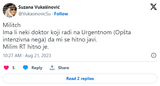 „Ima li neki doktor koji radi na Urgentnom (Opšta intenzivna nega) da mi se hitno javi. Milim RT hitno je“, napisala je Suzana.
