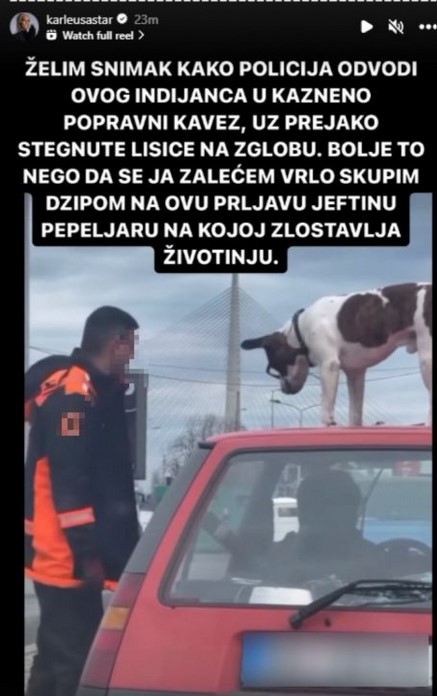 Na snimku se jasno vidi kako čovek koji nije poznat javnosti vozi automobil, dok mu na krovu stoji pas. Životinja koja je vidno uplašena i istraumirana preko očiju je imala i crne naočare za sunce, a snimak se ubrzo proširio na društvenim mrežama. Ova objava uznemirila je domaću javnost koja nije mogla da veruje šta se dešava u našoj prestonici.