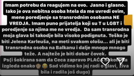 – Teško je biti Jelena Karleuša na meti svakom ološu, ali je biti transrodna osoba na Balkanu i dalje mnogo, mnogo teže. Najteže je biti dobar čovek – nastavila je Karleuša u sklopu Insta storija, a je potkačila i Cecu: