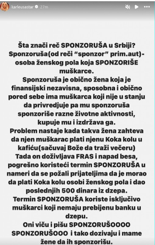 -Problem nastaje kada takva žena zahteva da njen muškarac plati njenu Koka kolu u kafiću (sačuvaj Bože da traži večeru“. Tada on doživljava fras i napad besa, pogrešno koristeći termin sponzoruša u nameri da se požali prijateljima da je morao da plati Koka kolu osobi ženskog pola i dao poslednjih 500 dinara iz džepa. Termin sponzoruša koriste isključivo muškarci koji nemaju prebijenu banku u džepu. Oni viču sponzorušo, sponzorušo i tako dozivaju i mame i žene da ih sponzorišu – dodala je pevačica.