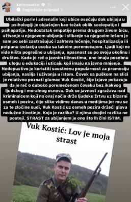 „Ljudi koji ne vide ništa pogrešno u ubijanju, opasnost su po svoju okolinu i društvo. Kada je reč o javnim ličnostima, one imaju posebnu ulogu u edukaciji i uticaju koji imaju na javno mnjenje“ – napisala je JK na svom Instagram storiju“.