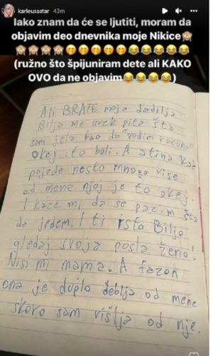 Pevačica Jelena Karleuša objavila je na svom Instagram nalogu stranicu iz dnevnika svoje mlađe naslednice Nike Tošić.